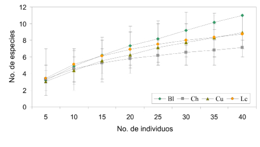 Para un tamaño de muestra estandarizado de 40 individuos, que corresponde al tamaño menor al cual convergen el resto de muestras en el análisis de rarefacción, se calcularon entre siete y once especies entre todos los sitios, con el límite inferior de cinco y el superior de 11 especies, y superposición de los intervalos de 95% de confianza (Fig. 2).