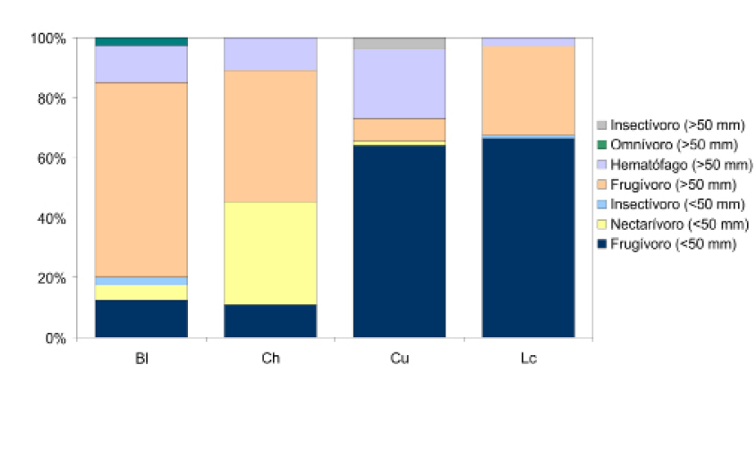 El porcentaje total de individuos capturados por gremio en orden de importancia fue el siguiente: 78.6% frugívoros, 11.4% hematófagos, 7.9% nectarívoros, 1.8% insectívoros y 0.4% omnívoros. La proporción de gremios en todos los sitios estuvo dominada por los frugívoros, variando de un máximo de 96.3% en la muestra en Lc a 54.4% en Ch (Fig. 3). En total se capturaron 32 murciélagos vampiros y su proporción fue significativamente menor al resto de gremios en las muestras (x2 = 17.727, g. l. = 3, P = 0.0005). El mayor número de capturas de murciélago vampiro se dio en Cu, con 18 individuos en una muestra de 78 murciélagos.
