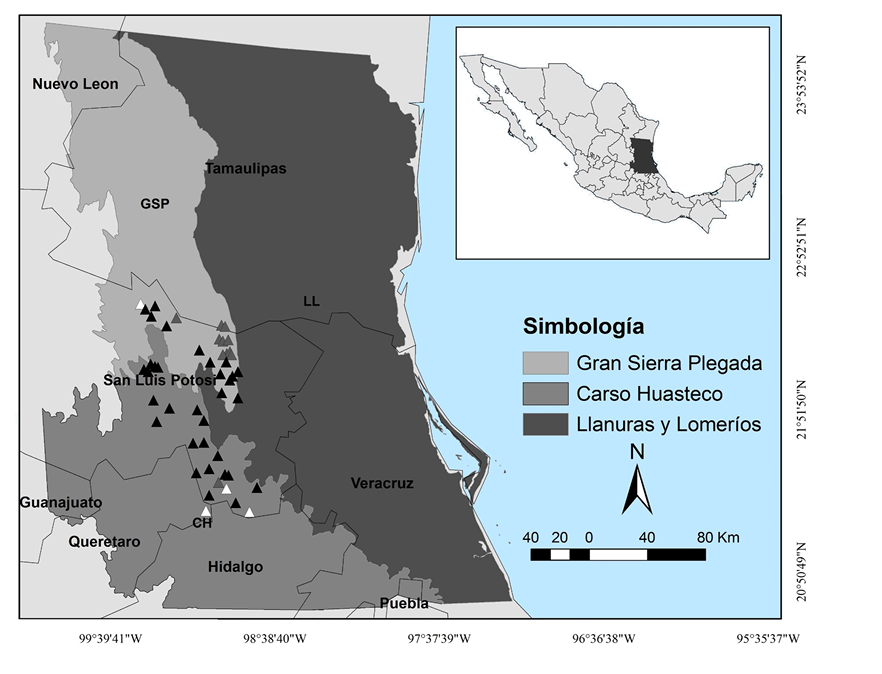 Study area. The study area partially covers two physiographic provinces (84,523 km2): Sierra Madre Oriental and Llanura Costera del Golfo Norte. In the first, it included part of the physiographic subprovinces Gran Sierra Plegada (GSP) and Carso Huasteco (CH). In the second, only the subprovince Llanuras y Lomerios (LL) was partially included (Figure 1). The characteristics of these subprovinces have great relevance in the landscape structure and degree of conservation. While in LL there is great antrophogenic impact throughout its surface due to topographic conditions, in CH, and mostly in GSP, large remnants of habitat remain in good condition. In this region, topography is flat to undulating towards the East and rough towards the West, with a wide range of climatic conditions from tropical to temperate, that varies from humid to semidry. There is a clear seasonal variation regarding precipitation, as well as a clear difference between the amount of rainfall in one region and the other. Altitude ranges from 0 to 2,300 m and precipitation from 600 to 2,500 mm.