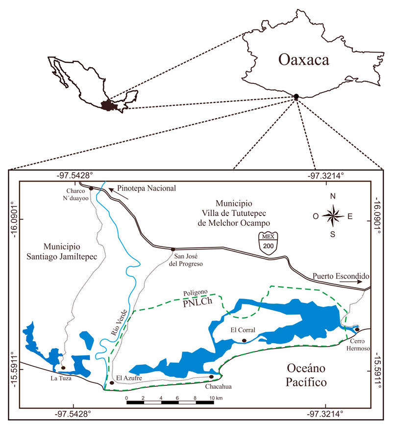 Las localidades El Azufre (16.0038° N, -97.3847° W, altitud 20 m), El Corral (15°5826° N, -97.3847° W, altitud 18 m) y Cerro Hermoso (15.5826°N, -97.3214° W, altitud 9 m), seleccionadas en el interior del polígono del Parque Nacional Lagunas de Chacahua. Las tres localidades presentan condiciones muy similares de vegetación, con la presencia de selva baja caducifolia en las partes altas y predominancia de manglar en las orillas de los cuerpos de agua. La selva baja caducifolia, se caracteriza por la baja altura de las especies arbóreas (5 a 10 m de altura) y porque la mayoría de estas especies pierden sus hojas por un periodo de 5 a 7 meses del año, provocando un contraste fisionómico enorme entre la época de seca y de lluvia (Lott et al. 1987). La distancia que existe entre estas tres localidades es de 12 km aproximadamente y están separadas por cuerpos de agua. La Tuza de Monroy (16.0333° N, -97.5138° W, altitud 17 m) es la localidad seleccionada más externa y foránea al polígono del Parque, a una distancia aproximada de 12 km en línea recta de la localidad de El Azufre. Esta área presenta grandes áreas de selva baja y mediana caducifolia en buen estado de conservación. Además, en estas localidades los asentamientos humanos son considerables, existen 400 habitantes en Cerro Hermoso, alrededor de 700 en El Azufre, 80 en El Corral y 300 en La Tuza de Monroy. El Corral es la localidad más aislada y considerada la zona núcleo del PNLCh. En todas las localidades figura la pesca y la extracción de madera como las principales actividades humanas.