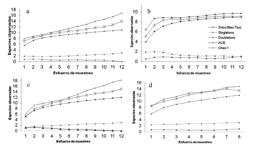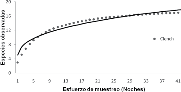 Se calculó el esfuerzo de muestreo por cada sitio, multiplicando el largo por el ancho de las redes de niebla, por el número de horas abiertas, el número de noches y número de redes empleadas. El resultado se expresó en m2 red/hora con base en el método propuesto por Medellín (1993) y modificado por López et al. (2009). Se elaboraron curvas de acumulación de especies por cada sitio, utilizando los estimadores no paramétricos ACE y Chao1, debido a que no asumen el tipo de distribución del conjunto de datos y no los ajustan a un modelo determinado (Palmer 1990), pero sí a la homogeneidad entre los hábitats, por lo que se consideran apropiados para los trabajos con murciélagos (López-Gómez y Williams-Linera 2006). Las curvas de acumulación se elaboraron utilizando el paquete estadístico EstimateS versión 8.2 (Colwell 2009). Se utilizó el modelo de Clench para evaluar la calidad del muestreo, mediante la relación entre el esfuerzo de muestreo y el número de especies encontradas (Colwell y Coddington 1994; Jiménez-Valverde y Hortal 2003).