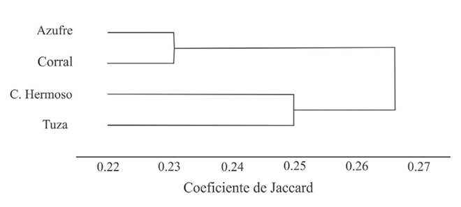 De las 17 especies registradas a lo largo del estudio, seis (33.3%) estuvieron representadas en las cuatro localidades. En tanto que cinco (27.7%) estuvieron registradas sólo en una de ellas, destacando La Tuza con tres especies exclusivas, lo que representa 16.6% del total registrado para los cuatro sitios. A partir del análisis de similitud se observan dos grupos, el primero conformado por El Azufre y El Corral (IJ = 23%) y el segundo por Cerro Hermoso y La Tuza (IJ = 25%; Fig. 4).