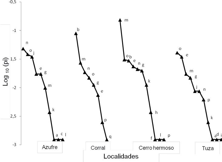 Las curvas de intervalo-abundancia muestran a los integrantes del género Artibeus en la parte superior, para La Tuza y El Azufre Artibeus lituratus fue la especie más abundante (log10 pi = -1.14), seguidas de otras especies como Dermanura phaeotis y Desmodus rotundus que fueron moderadamente abundantes (log10 pi = -1.41 y -1.76, respectivamente). En El Corral la especie más abundante fue Balantiopteryx plicata (log10 pi = -1.05) seguida de A. lituratus (log10 pi = -1.73), el resto de las especies están agrupadas en la parte media de la curva y al final se encuentran dos especies raras (Centurio senex y Myotis fortidens). En la curva que representa a Cerro Hermoso se encuentra como especie abundante Artibeus jamaicensis (log10 pi = -0.81) precedida de A. lituratus (log10 pi = -1.67), a su vez, se presentan tres especies raras (Glossophaga morenoi, Sturnira ludovici y M. fortidens; Fig. 5).